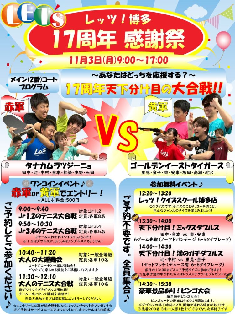 さて、11月3日(月)(文化の日)は、レッツ!博多店の17周年大感謝祭を行います!