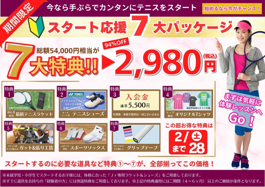 ●経験者の方には、別途パッケージ(ガットやレッスンチケットなど)をご用意しております。